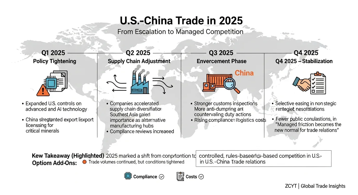 As 2025 draws to an end, U.S.–China trade relations remain one of the most consequential—and complex—forces shaping global commerce. This year did not bring a full reset, but it did offer clearer signals about how the two economies intend to coexist: less illusion of decoupling, more reality of managed competition.